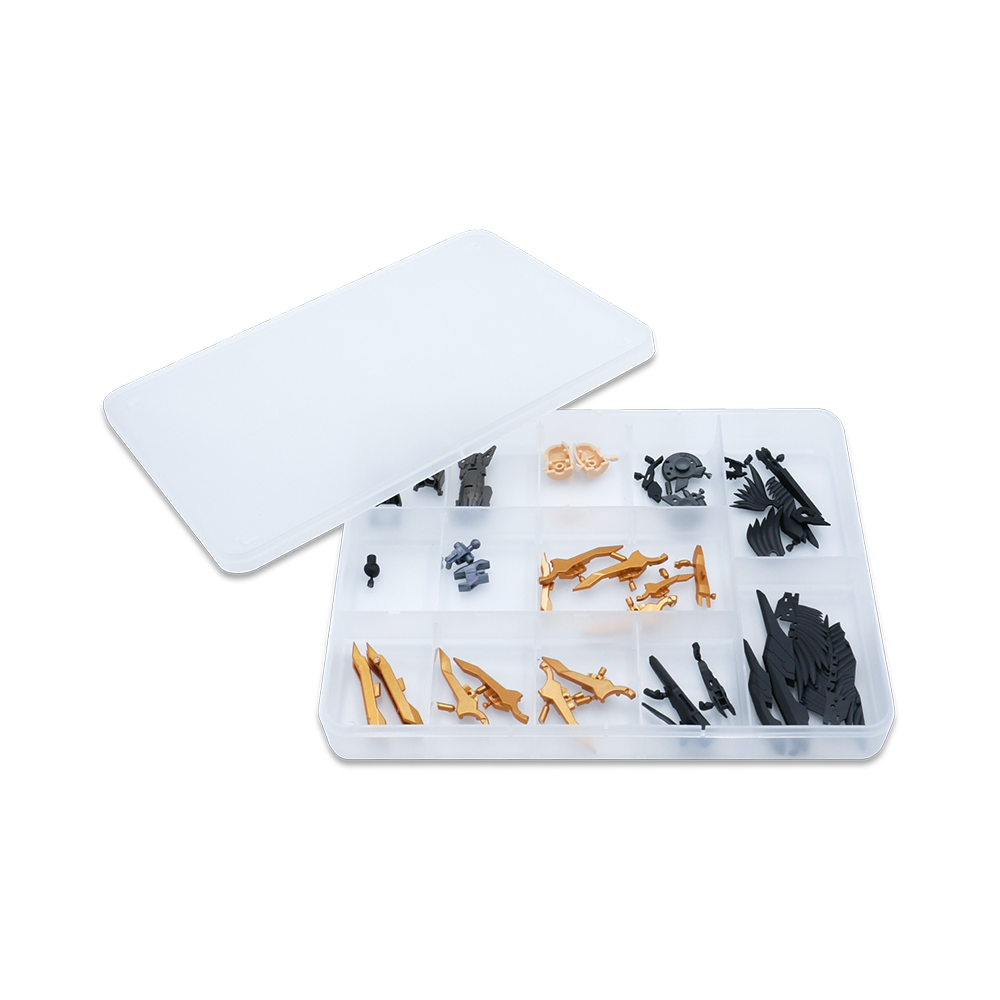 取り外し可能な仕切りが8枚付属しており、パーツのサイズや数に合わせて調整できるため、長尺の武器や大きなパーツも収納可能です。
