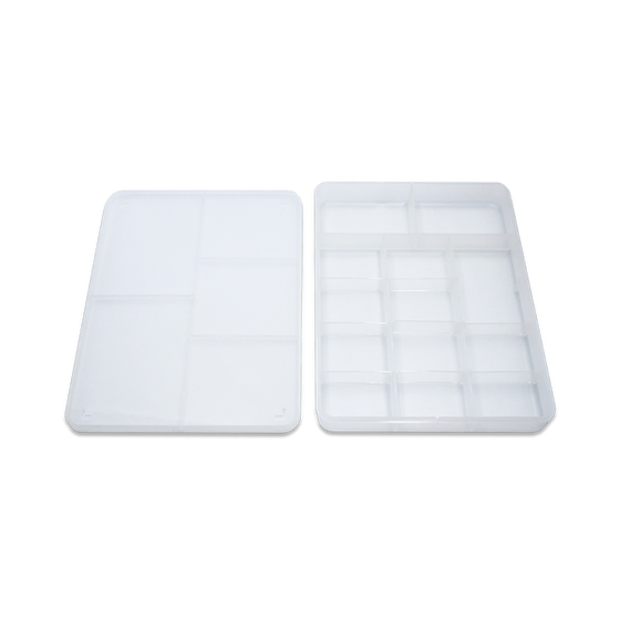 フタは両面で異なる形状となっており、片面は大きな部品を仕分けるためのトレイとしても使用可能です。