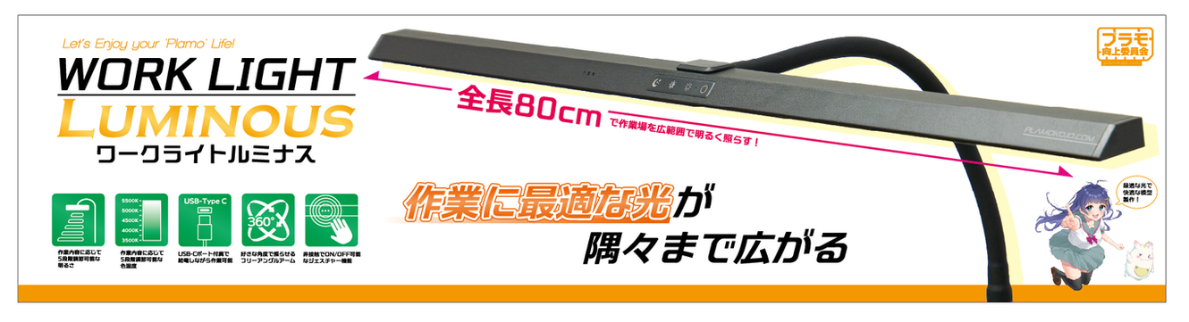 【ワークライトLuminous】は、模型製作に最適な光で作業スペースをより広く、より明るく照らすデスクライトです。